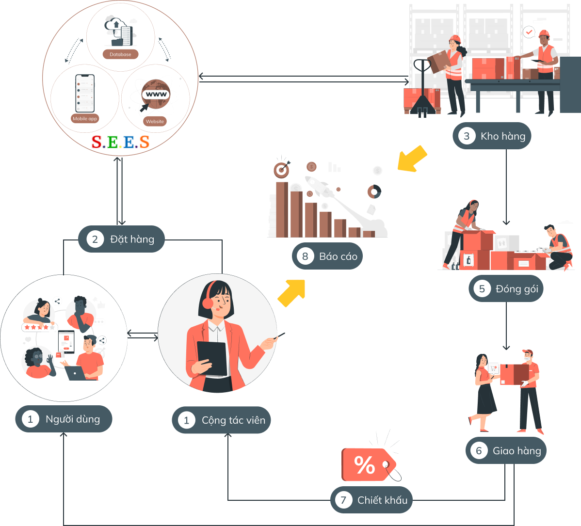 đơn hàng doanh nghiệp quản lý sàn sẽ chủ động gửi hàng đến người mua và hệ thống chia hoa